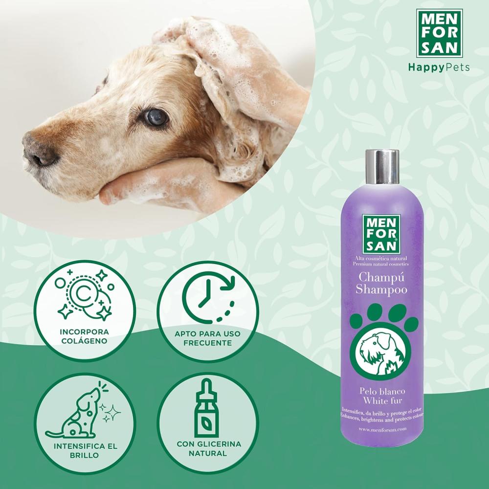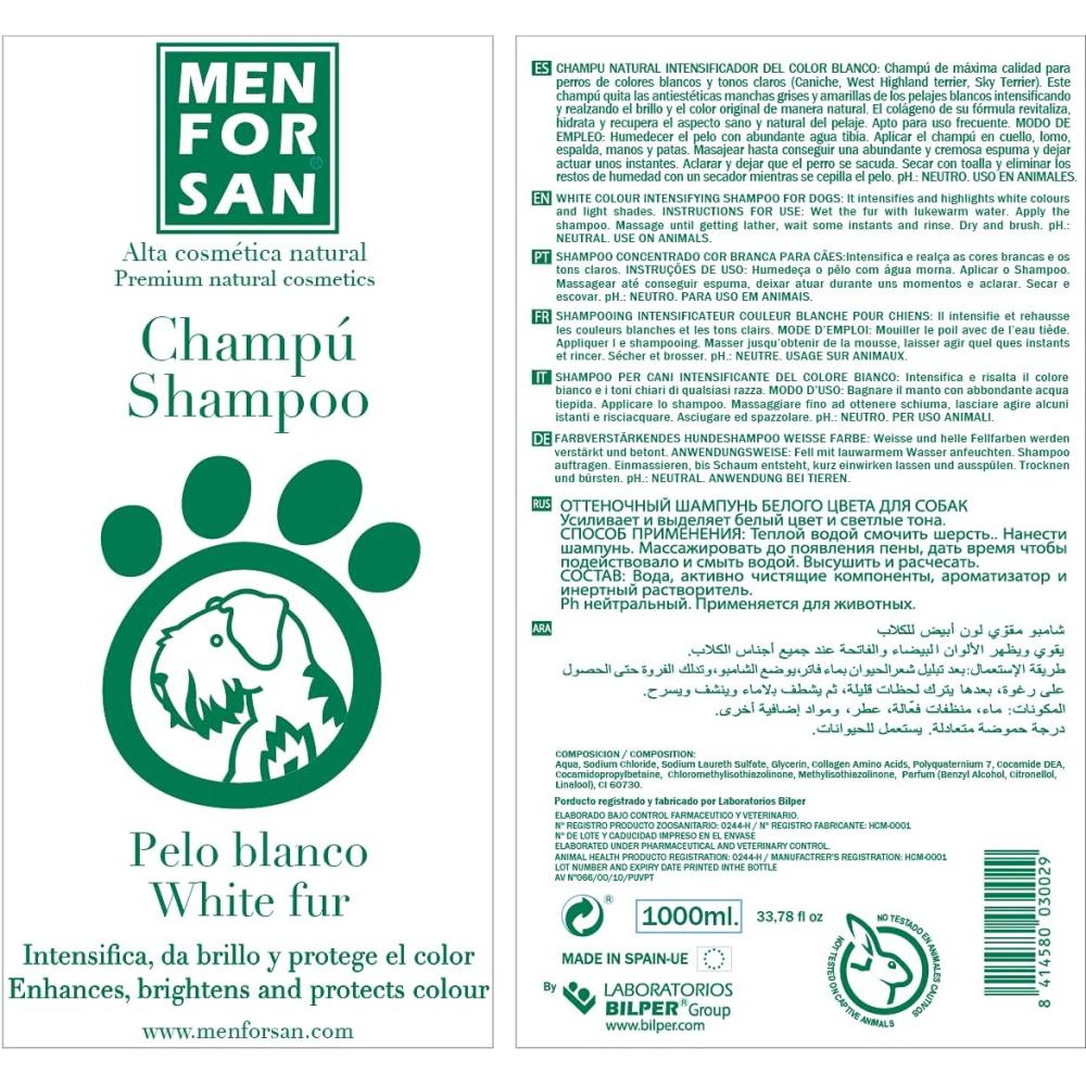 CHAMPÚ PARA PELOS BLANCOS: Champú de máxima calidad para perros de colores blancos y tonos claros (Caniche, West Highland terrier, Sky Terrier). INTENSIFICA Y REALZA EL BRILLO Y COLOR: Quita las antiestéticas manchas grises y amarillas de los pelajes blancos intensificando y realzando el brillo y el color de manera natural. CONTIENE COLÁGENO: El colágeno de su fórmula revitaliza, hidrata y recupera el aspecto sano y natural del pelaje. PH NEUTRO: Este champú está diseñado por veterinarios y farmacéuticos para garantizar el cuidado y la protección del animal durante y después del lavado APTO PARA USO FRECUENTE: Debido a que es un producto con el pH adaptado a la piel de los perros se puede utilizar frecuentemente en el animal sin dañar su pelaje y su piel. MODO DE EMPLEO: Humedecer el pelaje con abundante agua tibia. Aplicar el champú en cuello, lomo, manos y patas. Masajear hasta conseguir una abundante y cremosa espuma y dejar actuar unos instantes. Aclarar y dejar que el perro se sacuda. Secar con toalla y eliminar los restos de humedad con un secador mientras se cepilla el pelo. Rango de edad: todas las etapas de la vida