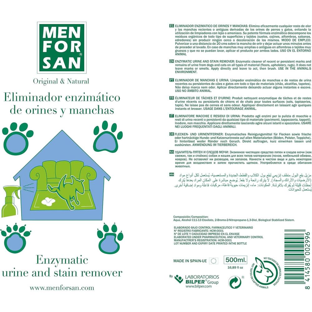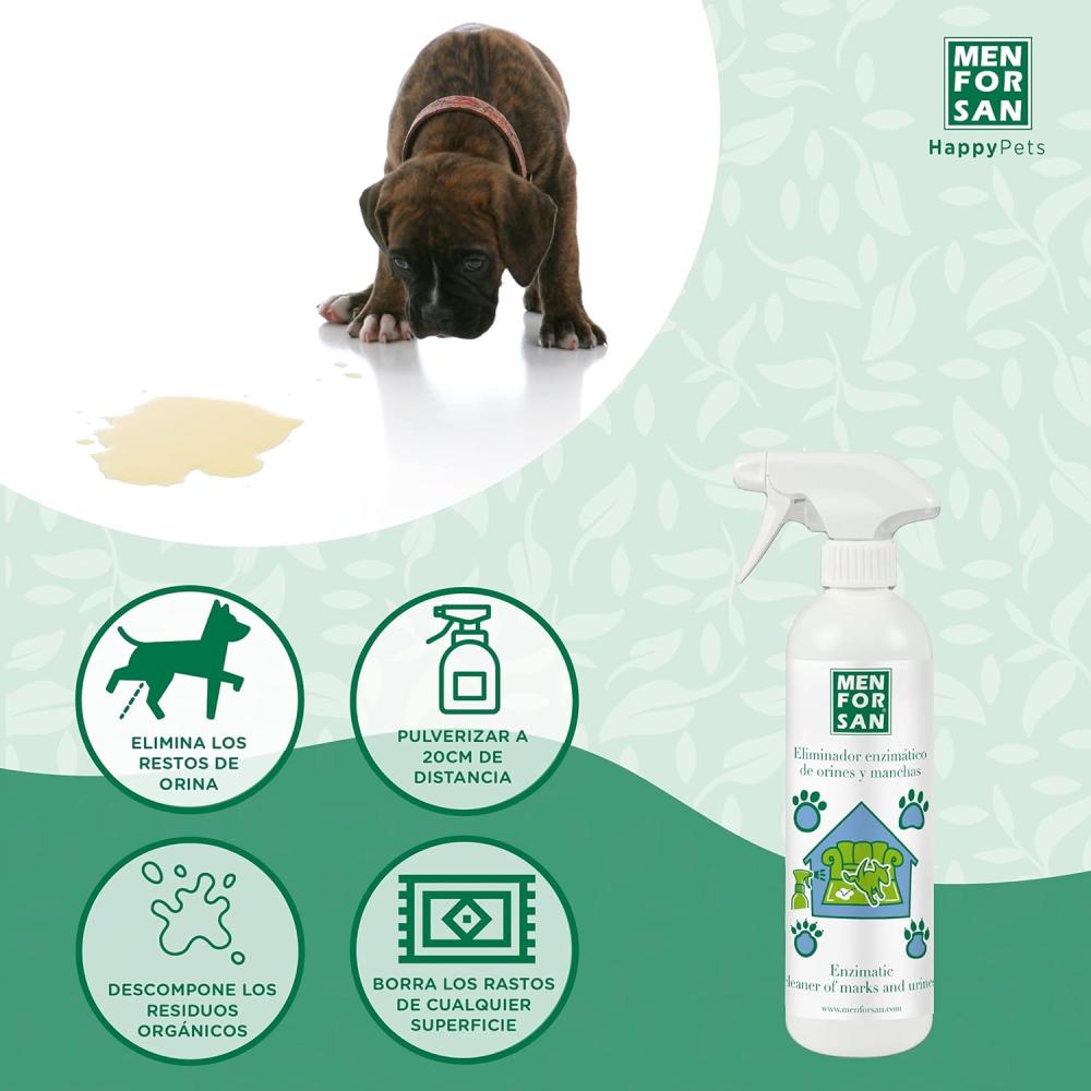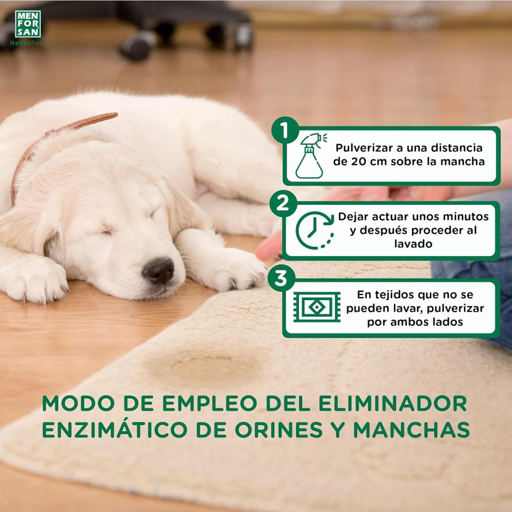 ELIMINA OLORES: Elimina eficazmente cualquier resto de olor y las manchas recientes o antiguas derivadas de los orines de perros y gatos, evitando la utilización de limpiadores con lejía o amoniaco. DESCOMPONE RESIDUEOS: Su fórmula enzimática descompone los residuos orgánicos de todo tipo de superficies y tejidos sin producir ningún cerco o decoloración de los mismos. TODO TIPO DE SUPERFICIES: Apto para todo tipo de superficies y tejidos: suelos, cojines, alfombras, sábanas, edredones. MODO DE EMPLEO: Pulverizar a una distancia de 20 cms sobre la mancha de orín y dejar actuar unos minutos antes de proceder al lavado. MENFORSAN: En Menforsan nos preocupamos por la salud de los animales y el cuidado del planeta, por lo que creamos productos naturales vegan friendly de la mejor calidad.