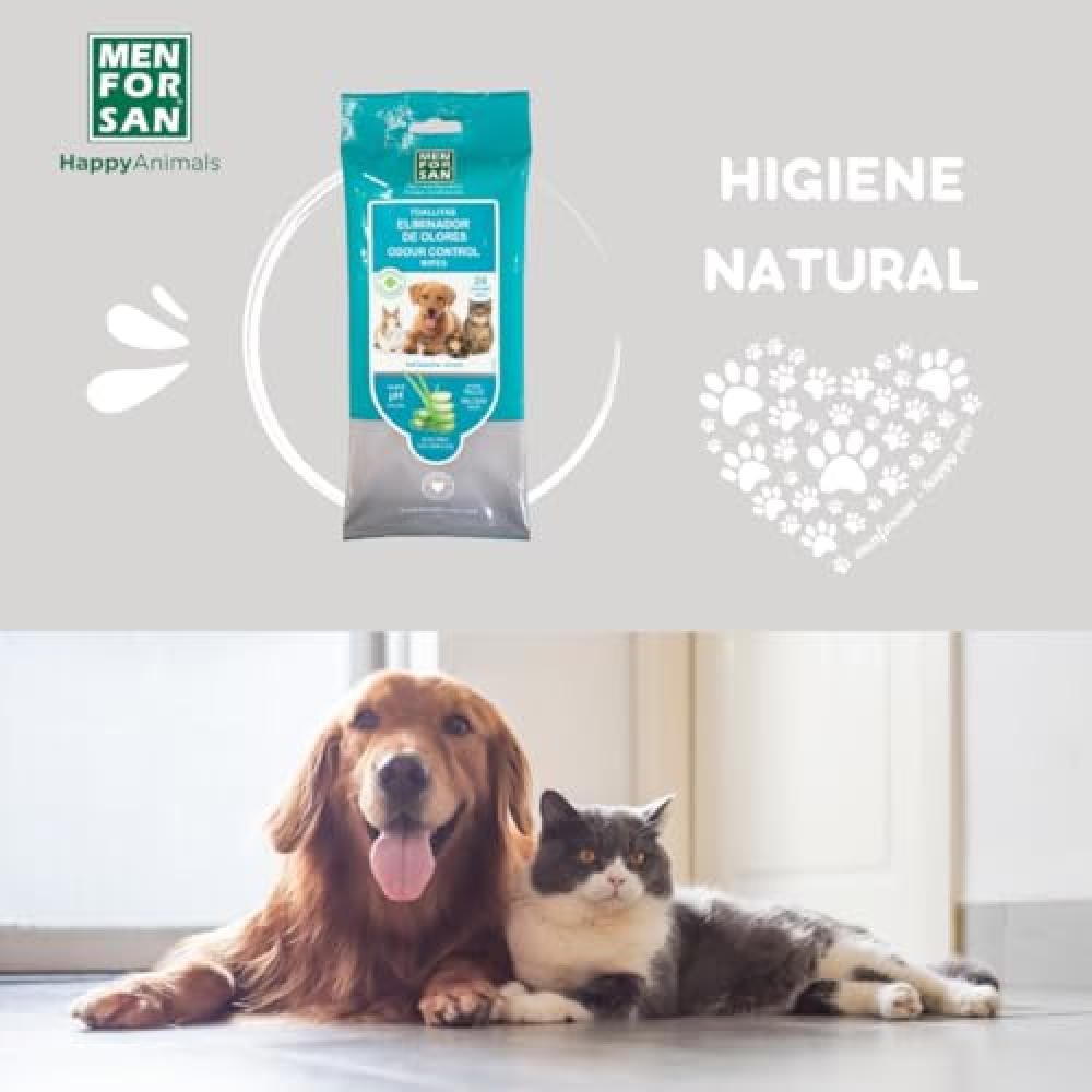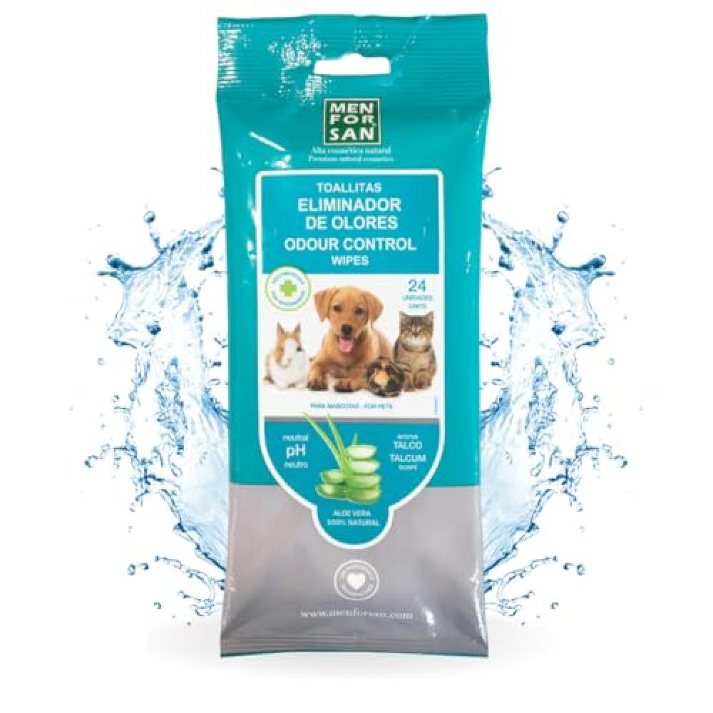TOALLITAS MASCOTA eliminador de olores de MEN FOR SAN. Limpian, desodorizan y perfuman la piel y el pelaje de manera cómoda y rápida de cualquier parte del cuerpo de perros gatos, roedores y hurones. Con delicada fragancia talco, contienen aloe vera 100% natural que hidrata y protege la piel aportando a la zona de aplicación brillo y suavidad. Sin alcohol ni parabenos, respetan el pH natural de la piel de la mascota. Cada sobre contiene 24 toallitas muy resistentes y amplias.